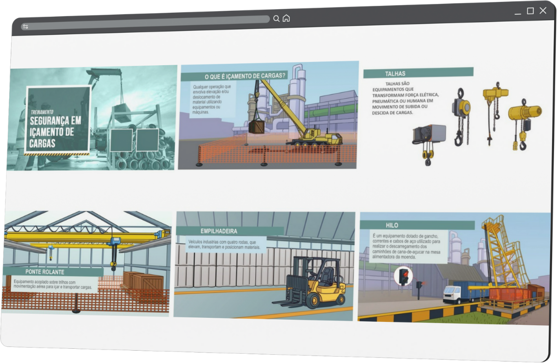 Desenvolvemos experiências de aprendizagem que aprimoram a forma de aplicação dos treinamentos corporativos e facilitam a comunicação interna em empresas de diversos segmentos, nas demandas das áreas de Segurança, Saúde, Meio Ambiente e Qualidade.